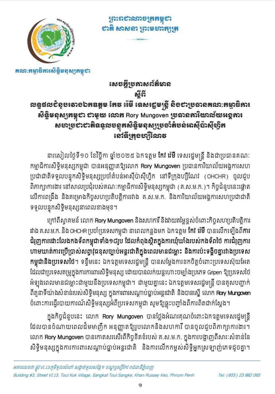 ការជំរុញនេះ ធ្វើឡើងនៅថ្ងៃទី ១០ ខែវិច្ឆិកា ឆ្នាំ ២០២៥ ក្នុងគ្រាដែលលោក កែវ រ៉េមី ទេសរដ្ឋមន្រ្តីនិងជាប្រធានគណៈកម្មាធិការសិទ្ធិមនុស្សកម្ពុជា ជួបពិភាក្សាការងារជាមួយ លោក Rory Mungoven ប្រធានការិយាល័យអង្គការសហប្រជាជាតិទទួលបន្ទុកសិទ្ធិមនុស្សប្រចាំតំបន់អាស៊ីប៉ាស៊ីហ្វិក នៅទីក្រុងហ្សឺណែវ។
