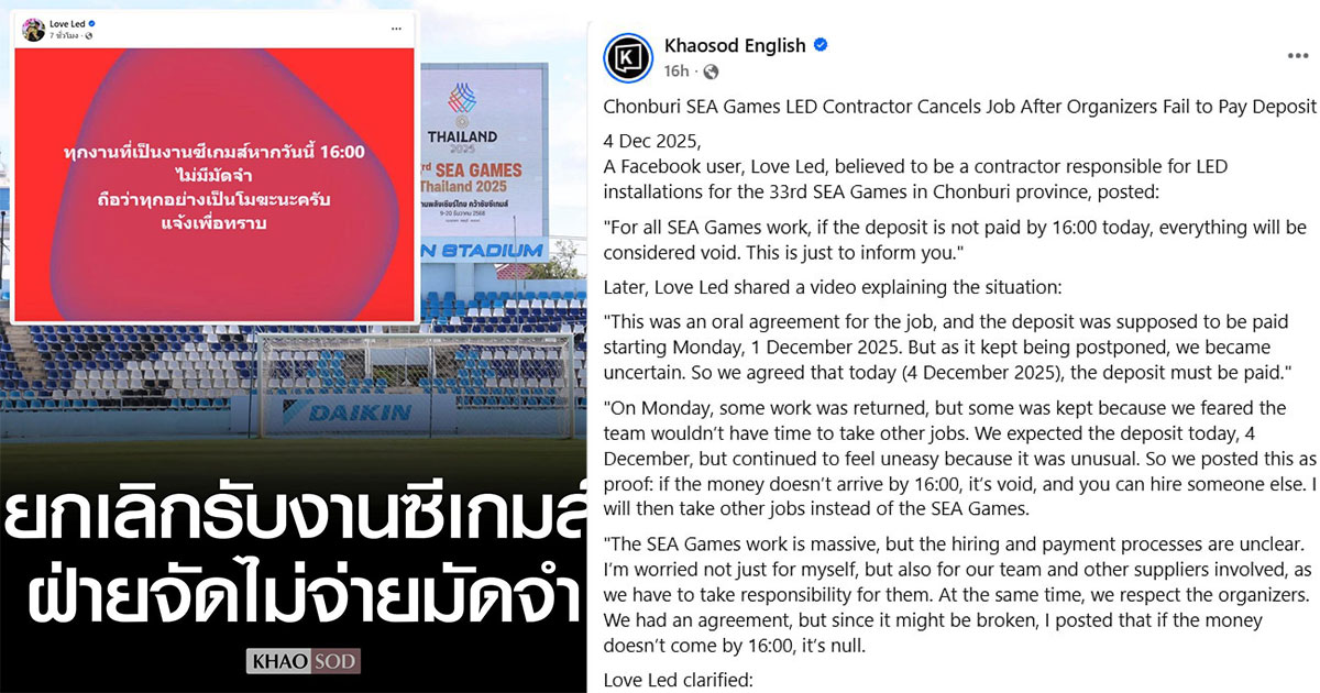 ខេត្តឈុនបុរី ៖ ភាពចម្រូងចម្រាសផ្នែកហិរញ្ញវត្ថុក្នុងការរៀបចំព្រឹត្តិការណ៍ស៊ីហ្គេម លើកទី ៣៣ (33rd SEA Games i) របស់ប្រទេសថៃ បានឈានដល់ចំណុចកំពូល នៅពេលដែលក្រុមហ៊ុនផ្គត់ផ្គង់ និងតម្លើងអេក្រង់ LED សម្រាប់តំបន់ប្រកួតក្នុងខេត្តឈុនបុរី បានសម្រេចចិត្តលុបចោលកិច្ចសន្យាការងាររបស់ខ្លួននៅថ្ងៃទី ៤ ខែធ្នូ ឆ្នាំ ២០២៥ បន្ទាប់ពីមិនទទួលបានការទូទាត់ប្រាក់កក់តាមការកំណត់។