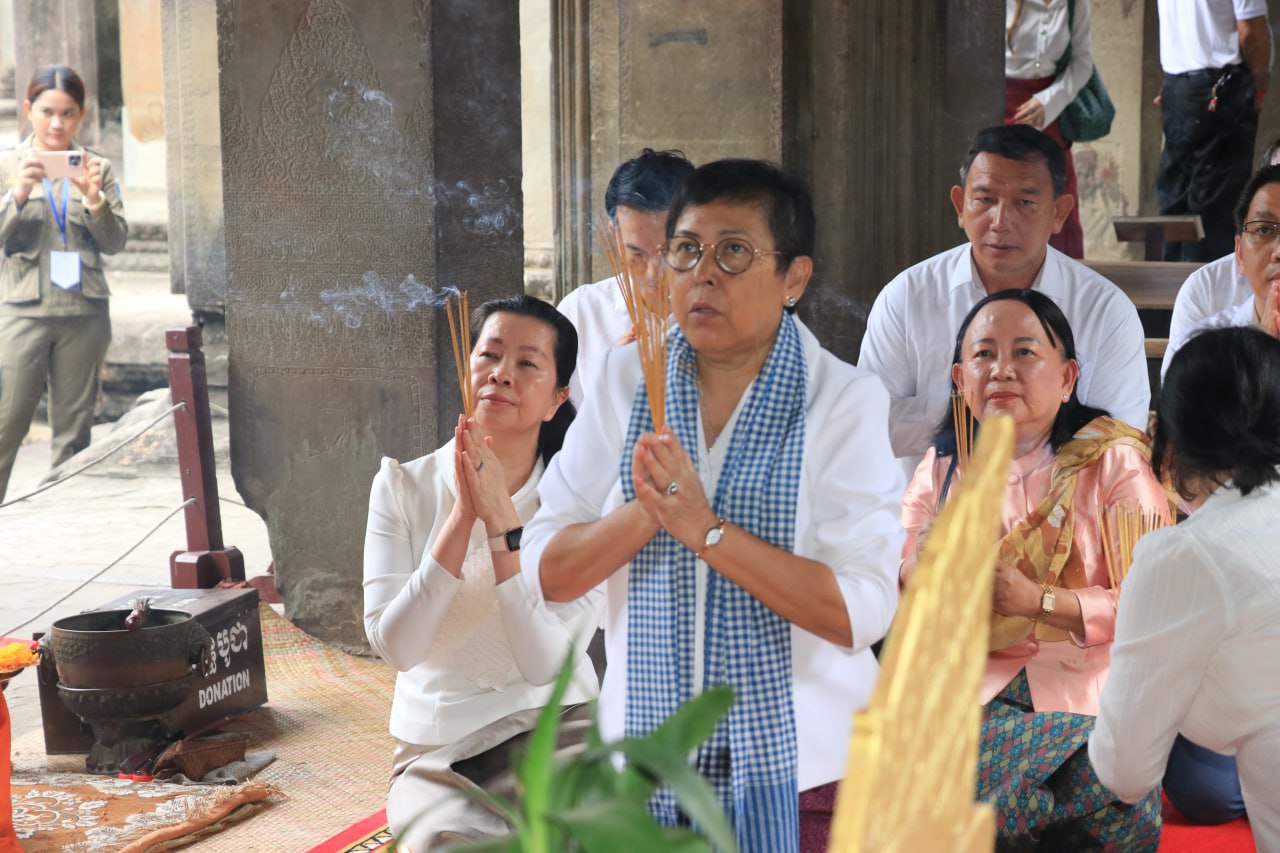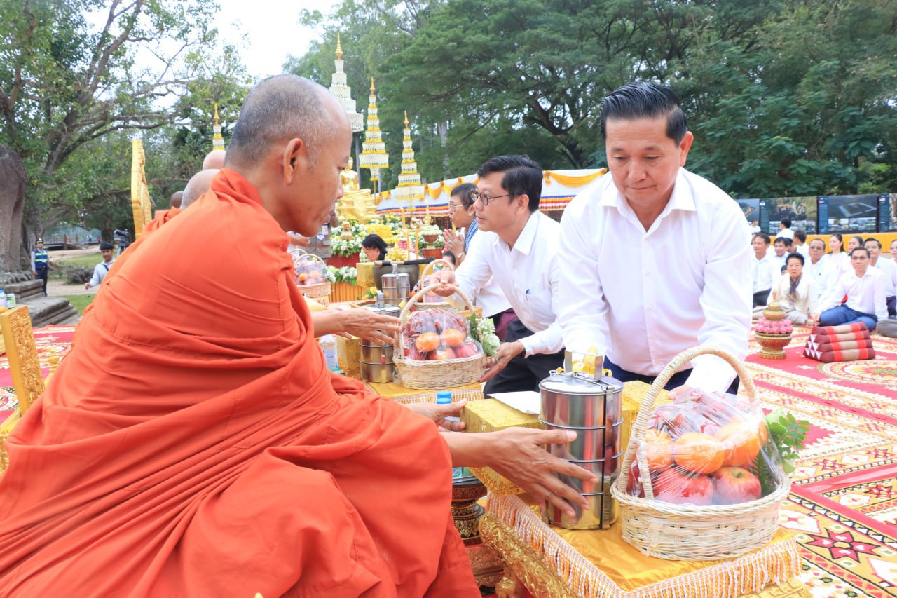 សៀមរាប៖ នាថ្ងៃទី១៤ ខែធ្នូ ឆ្នាំ២០២៥ លោកជំទាវ បណ្ឌិតសុភាចារ្យ ភឿង សកុណា រដ្ឋមន្ត្រីក្រសួងវប្បធម៌ និងវិចិត្រសិល្បៈ និងជាប្រធានក្រុមប្រឹក្សានៃអាជ្ញាធរជាតិអប្សរា បានអញ្ជើញដឹកនាំថ្នាក់ដឹកនាំជាច្រើនរូប រៀបចំពិធីបួងសួងផ្នែកសាសនានៅមុខនាគនៃប្រាសាទអង្គរវត្ត ដើម្បីសុំសេចក្ដីសុខ សន្តិភាព និងរំលឹកគុណបុព្វបុរសខ្មែរ ក៏ដូចជាឧទ្ទិសកុសលផលបុណ្យ ជូនចំពោះវិញ្ញាណក្ខន្ធបុព្វបុរសខ្មែរ និងវីរកងទ័ពខ្មែរគ្រប់ជំនាន់ ដែលបានពលីជីវិតក្នុងបុព្វហេតុការពារទឹកដី។