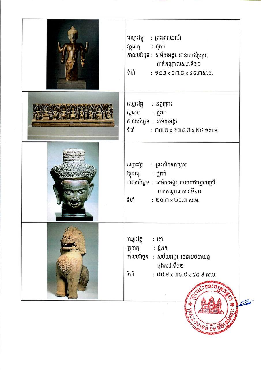 យោងតាមសេចក្តីជូនព័ត៌មានរបស់ក្រសួងនៅថ្ងៃទី១៨ ខែធ្នូ នេះ បញ្ជាក់ថា ការសម្រេចជាផ្លូវការនេះធ្វើឡើងបន្ទាប់ពីគណៈកម្មការសិល្បៈ អាស៊ីបានបោះឆ្នោតយល់ព្រមជាឯកច្ឆន្ទ កាលពីថ្ងៃទី២៤ ខែកញ្ញា ឆ្នាំ២០២៥ ដោយបញ្ជាក់ថា វត្ថុបុរាណខ្មែរដ៏វិចិត្រទាំង៣៣រូប បាននាំចេញពីកម្ពុជាដោយខុសច្បាប់ ដែលជាការបំពានលើច្បាប់សហព័ន្ធ និងផ្អែកលើភស្តុតាងនានាដែលរកឃើញដោយភ្នាក់ងារសន្តិសុខមាតុភូមិសហរដ្ឋអាមេរិក រួមទាំងក្រុមស្រាវ ជ្រាវកម្ពុជា និងក្រុមការងារសារមន្ទីរសិល្បៈអាស៊ី។