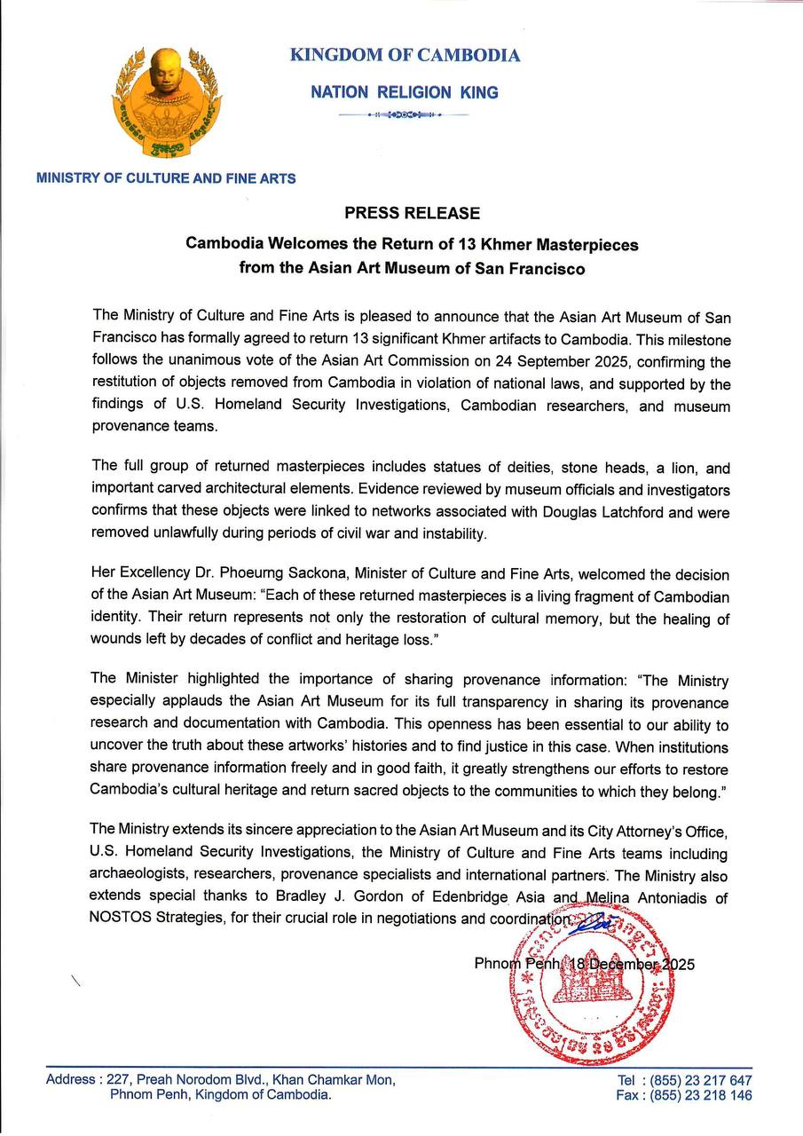 សារមន្ទីរសិល្បៈអាស៊ីសាន់ហ្វ្រាន់ស៊ីស្កូសហរដ្ឋអាមេរិក ប្រគល់មកវិញនូវត្ថុបុរាណខ្មែរ ១៣ រូប ដល់កម្ពុជា