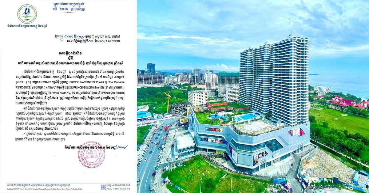 គម្រោងលំនៅដ្ឋាន និងខុនដូចំនួន ៥ របស់ក្រុមហ៊ុនព្រីនស៍ ត្រូវបាននិយ័តករផ្អាកប្រតិបត្តិការលក់ គម្រោងលំនៅដ្ឋាន និងខុនដូចំនួន ៥ របស់ក្រុមហ៊ុនព្រីនស៍ ត្រូវបាននិយ័តករផ្អាកប្រតិបត្តិការលក់