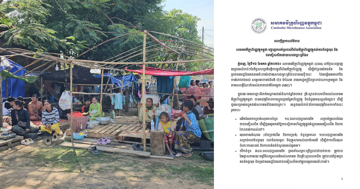 ភ្នំពេញ៖ សមាគមមីក្រូហិរញ្ញវត្ថុកម្ពុជា (CMA) នៅថ្ងៃនេះបង្ហាញលទ្ធផលសំខាន់ៗនៃកិច្ចសហប្រតិបត្តិការក្នុងវិស័យមីក្រូហិរញ្ញវត្ថុ ដើម្បីគាំទ្រដល់កងទ័ព និងប្រជាពលរដ្ឋដែលរងផលប៉ះពាល់ដោយសារជម្លោះព្រំដែននាពេលថ្មីៗនេះ ដែលឆ្លើយតបទៅនឹងការអំពាវនាវរបស់ សម្តេចមហាបវរធិបតី ហ៊ុន ម៉ាណែត នាយករដ្ឋមន្រ្តីកម្ពុជា និងតាមសេចក្តីណែនាំរបស់ធនាគារជាតិនៃកម្ពុជា (NBC)។