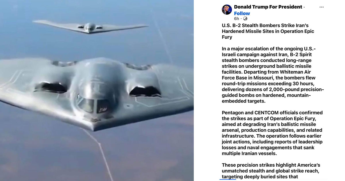 វ៉ាស៊ីនតោន៖ ក្នុងការកើនឡើងថ្មីនៃភាពតានតឹងរវាងសហរដ្ឋអាមេរិក និងអ៊ីស្រាអែល ជាមួយអ៊ីរ៉ង់ យន្តហោះទម្លាក់គ្រាប់បែកបំបាំងកាយប្រភេទ Northrop B-2 Spirit បានអនុវត្តការវាយប្រហាររយៈចម្ងាយឆ្ងាយ លើទីតាំងមីស៊ីលបាលីស្ទីកក្រោមដីរបស់ Iran ដែលលោក ត្រាំហៅថា ប្រតិបត្តិការ “Epic Fury”។