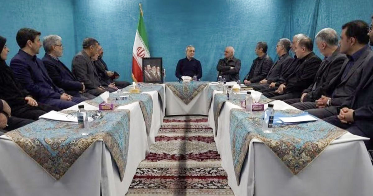 រូបភាពដែលត្រូវបានផ្សព្វផ្សាយដោយប្រព័ន្ធផ្សព្វផ្សាយរដ្ឋ បង្ហាញថា គណៈរដ្ឋមន្ត្រីរបស់ប្រធានាធិបតី Masoud Pezeshkian បានអង្គុយជុំវិញតុប្រជុំមួយ ដែលត្រូវបានដាក់នៅកណ្ដាលអាងហែលទឹក ហើយមានជញ្ជាំងក្បឿង និងជណ្ដើរអាងជុំវិញ។