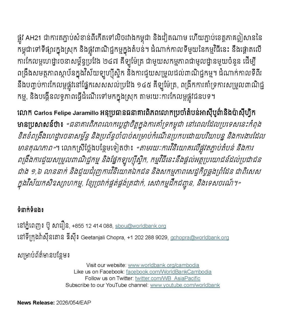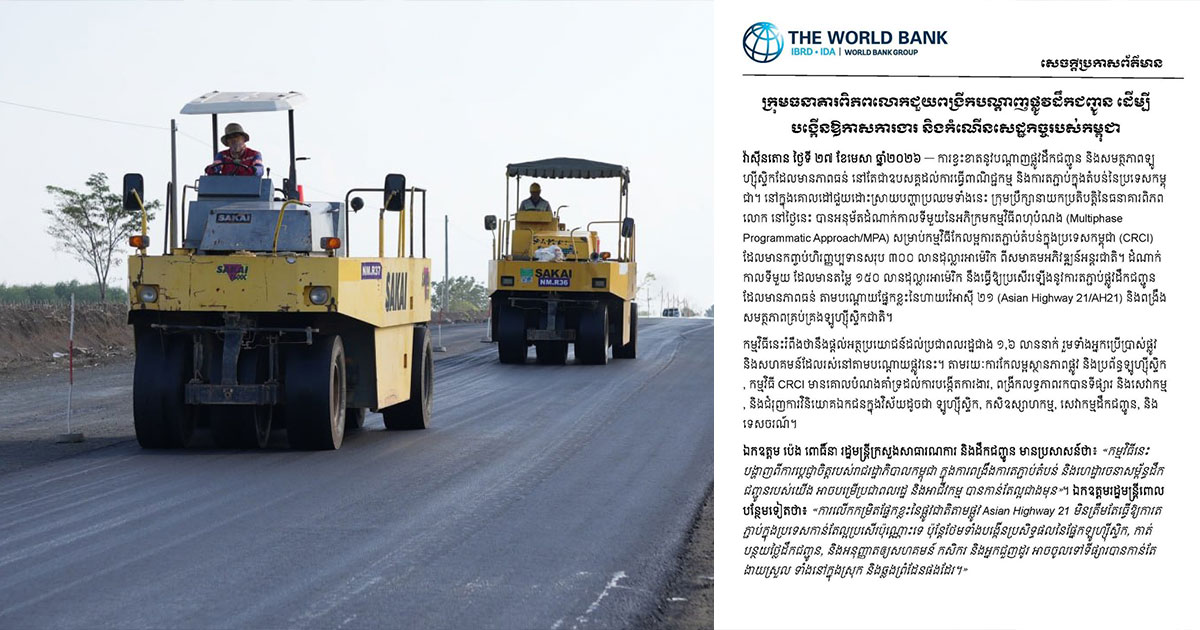 វ៉ាស៊ីនតោន៖ ក្រុមធនាគារពិភពលោក នៅថ្ងៃទី ២៧ ខែមេសា ឆ្នាំ២០២៦បានសម្រេចទម្លាក់កញ្ចប់ហិរញ្ញប្បទាន ៣០០ លានដុល្លា ជួយពង្រីកបណ្តាញផ្លូវដឹកជញ្ជូន ដើម្បីបង្កើនឱកាសការងារ និងកំណើនសេដ្ឋកិច្ចរបស់កម្ពុជា។ ការទម្លាក់កញ្ចប់ហិរញ្ញប្បទាននេះ ក្រោយពីក្រុមធនាគារពិភពលោកពិនិត្យឃើញពីការខ្វះខាតនូវបណ្តាញផ្លូវដឹកជញ្ជូន និងសមត្ថភាពឡូហ្ស៊ីស្ទិកដែលមានភាពធន់ នៅតែជាឧបសគ្គដល់ការធ្វើពាណិជ្ជកម្ម និងការតភ្ជាប់ក្នុងតំបន់នៃប្រទេសកម្ពុជា។
